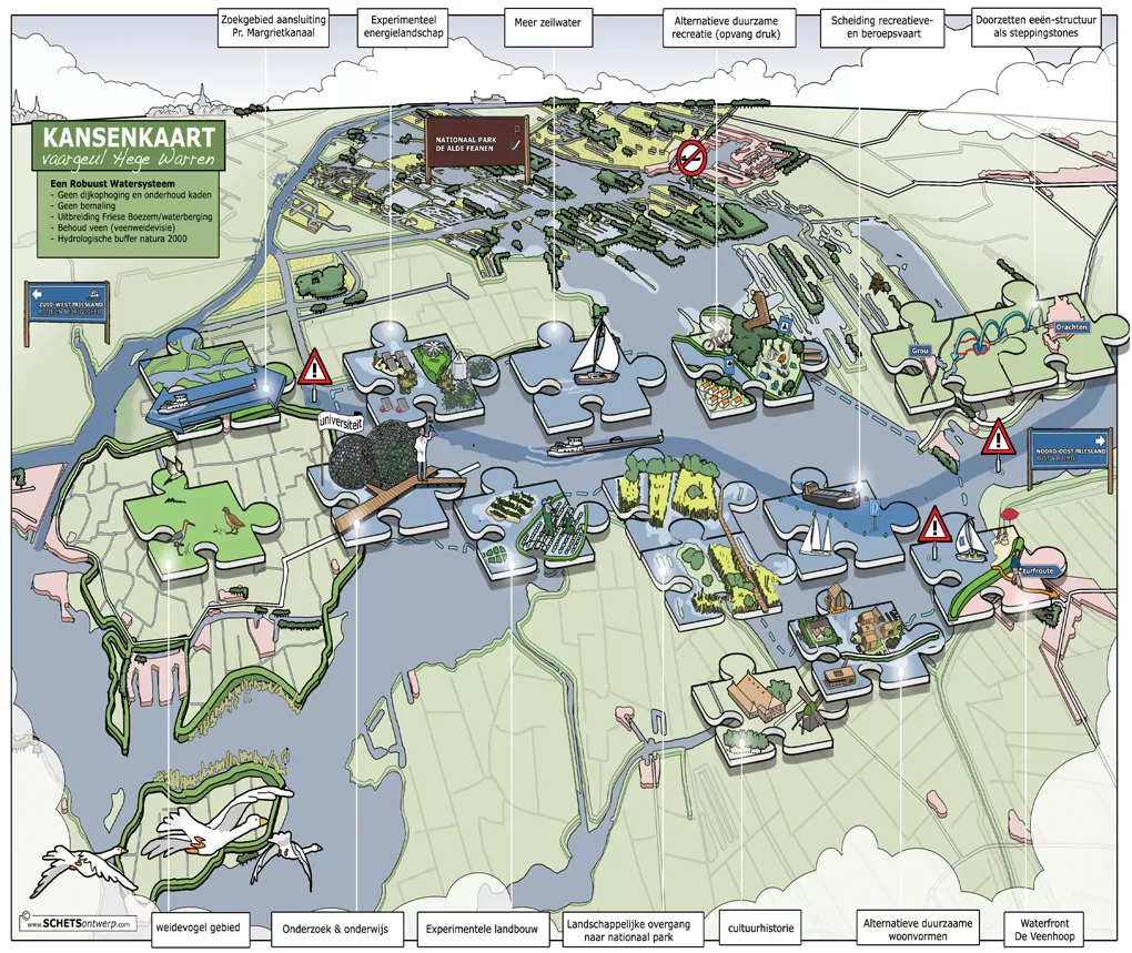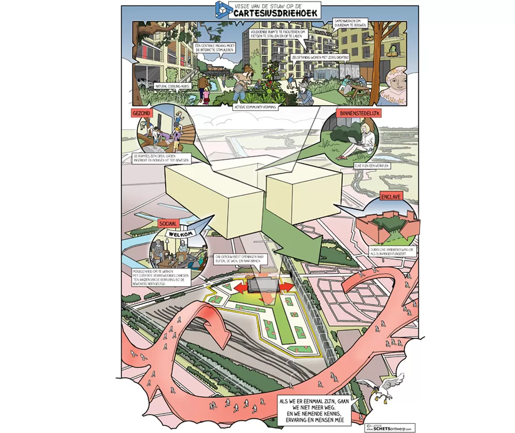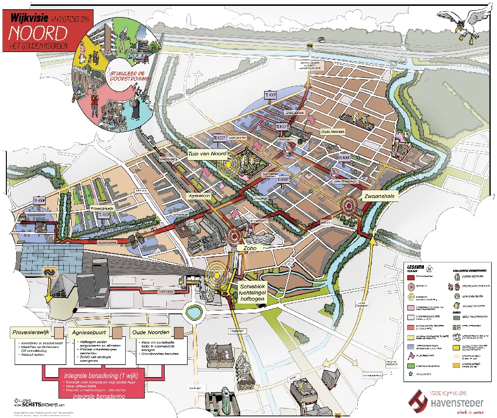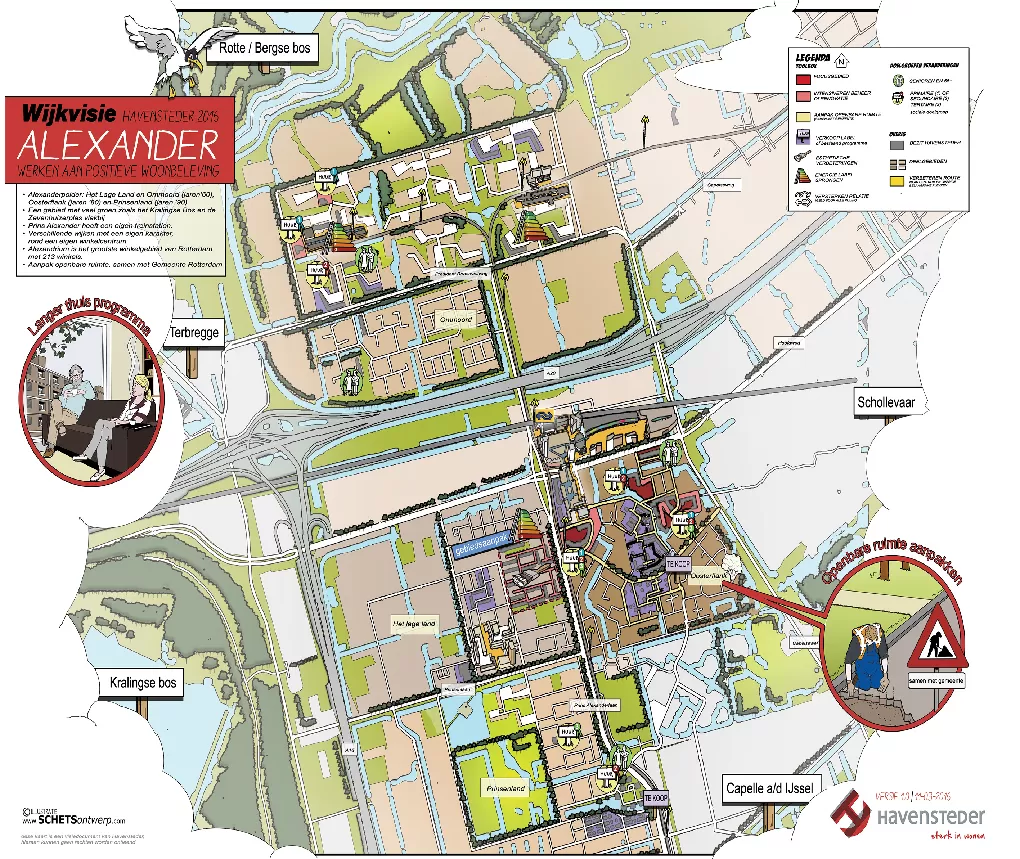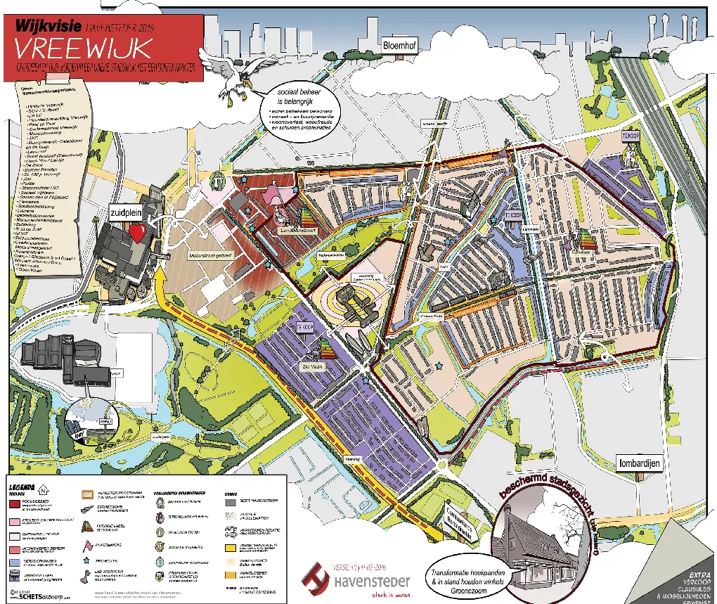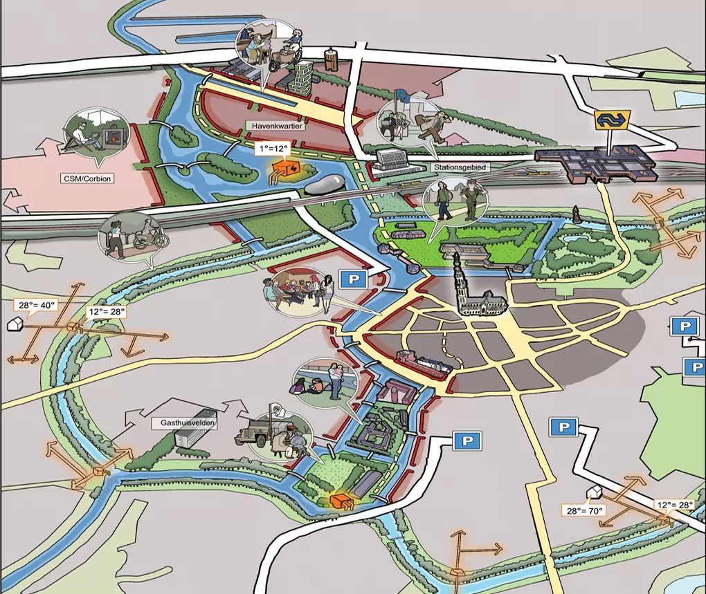 Een ruimtelijke visie is soms nog niet concreet genoeg om concreet in te kunnen tekenen. Het maken van een cartoonstijl visiekaart kan dan strategisch zijn. Deze lijkt -in tegenstelling tot een autocad kaart- losser en niet zo definitief. Kortom het is een werk- of groeikaart, die ruimte laat voor verdere ontwikkelingen in uw proces. Als stedenbouwkundige ben ik goed in staat om uw plan te analyseren en te vertalen naar heldere principes en kaartlagen. Ik kan zelfstandig de uitkomsten van een workshop of participatiebijeenkomst achteraf vertalen naar een legenda en visiekaart.